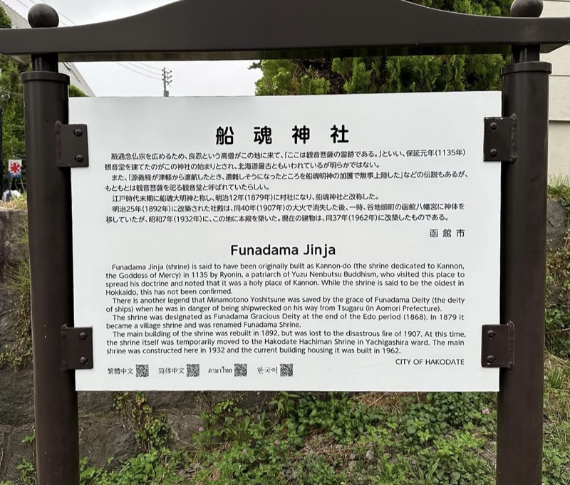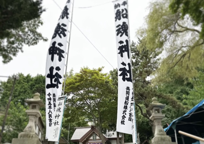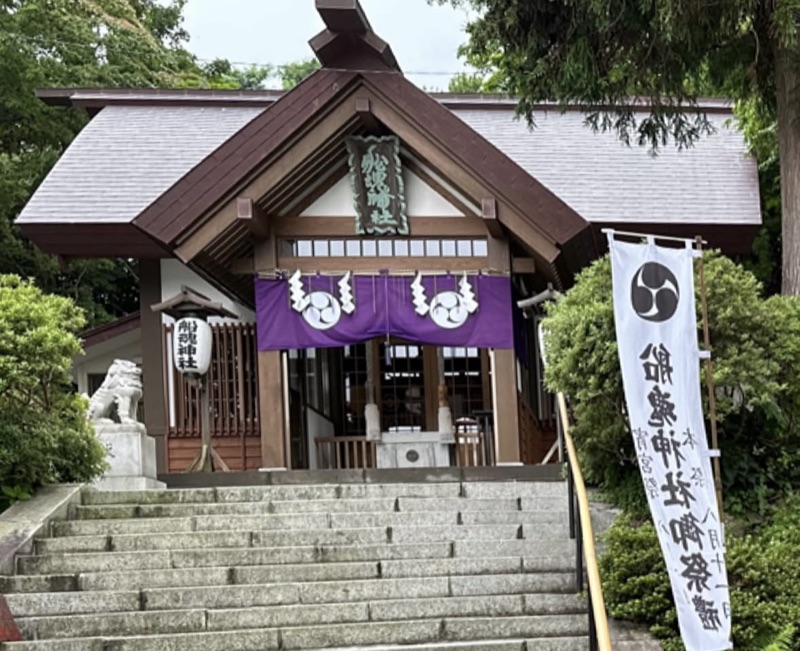 1135年(保延元年)、高層・良忍上人が観音堂を建立したのが由緒とされ、「北海道最古の神社」として知られていま。かつては観音堂でしたが、江戸時代に船魂大明神として祀られ、明治期に村社格に列し、現在の鉄筋コンクリート造社殿は1962年(昭和37年)に建立されました。